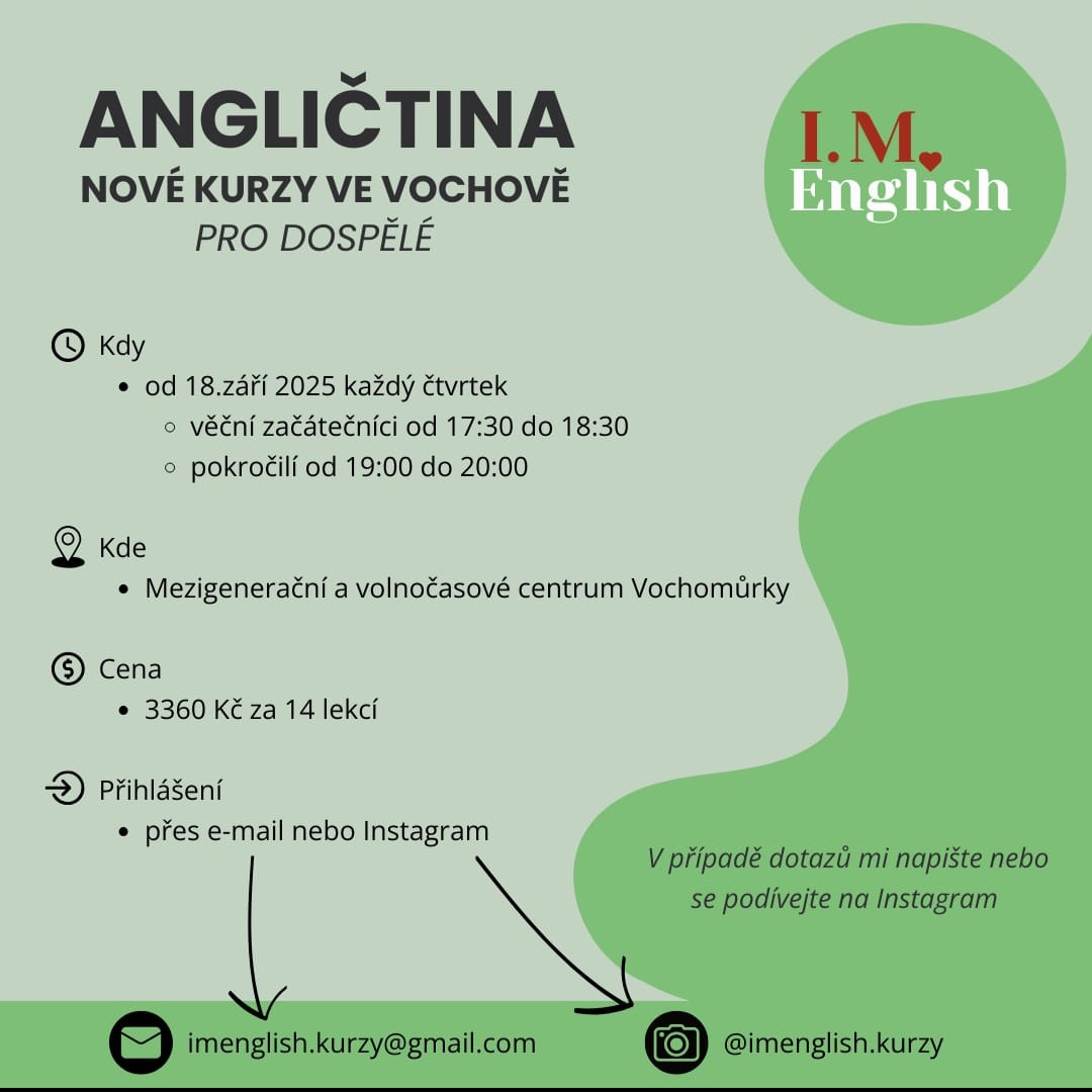 Nově od září 2025 ANGLIČTINA pro dospělé s Mgr. Irenou Mlčákovou. Lektorka Mgr. Irena Mlčáková se s angličtinou setkala poprvé ve čtyřech letech, kdy se s rodinou na dva roky přestěhovala do Pittsburghu v USA. Vystudovala anglistiku-amerikanistiku na FF UK v Praze. Během studií absolvovala dva semestrální pobyty v Limericku v Irsku a ve Washingtonu, D.C. V zahraničí sbírala také pracovní zkušenosti během četných služebních cest do Kanady a USA. Kromě výuky se věnuje překládání knih a filmových titulků.